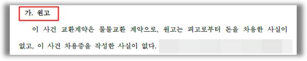 [원고 주장의 요지]원고는 피고의 강제집행을 막기 위해, 본 계약은 물물교환일 뿐 돈을 차용한 사실이 없고, "이 사건 차용증을 작성하여 피고에게 교부한 사실이 전혀 없다"고 주장하였습니다.