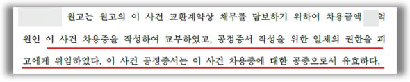 [법원의 판단 (피고 전부 승소)]법원은 본 저희 법무법인의 주장을 전부 받아들여, ① 원고가 이 사건 차용증에 원고의 성명, 주민등록번호, 주소, 연락처를 직접 기재하고 원고 법인의 직인과 원고의 개인 인장을 날인한 사실이 인정된다. ② 무엇보다, 이 사건 교환계약서에 이 사건 차용증이 첨부되어 있고, 이 사건 교환계약서 및 이 사건 차용증에 원고와 피고가 함께 간인(間印)을 한 사실이 인정된다. 따라서 이 사건 차용증은 이 사건 교환계약서와 함께 체결된 문서로서 그 진정성립이 인정된다며 원고의 이 부분 주장은 이유 없다고 판단하였습니다.