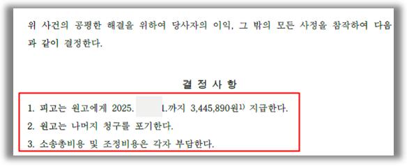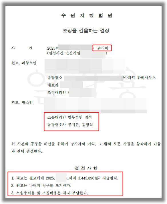 [법원의 판단]법원은 법무법인 정석의 주장을 대부분 수용하여 "조정을 갈음하는 결정"을 내렸습니다. 즉, 법원은 원고가 청구한 8,634,460원 중, 전유부분 관리비와 연체료를 전액 배제하고, 피고가 주장한 소멸시효가 완성된 기간의 공용부분 체납관리비를 공제한 후, 최종적으로 피고는 원고에게 3,445,890원만을 지급하라고 결정하였습니다.