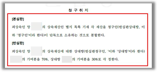 [사건의 개요]피상속인은 2023. 9.경. 사망하였으며, 그 상속인으로는 배우자인 상대방 1과 자녀 5인(이 중 1인은 상속포기 신고를 마쳤습니다)이 있었습니다. 이에 따라 법정상속분은 배우자가 3/11, 의뢰인을 포함한 자녀 4인이 각 2/11로 확정되었습니다. 그리고 분할 대상 상속재산의 총 가액은 상속개시 당시 기준 약 8억 6,900만 원이었습니다. 의뢰인은 본 법무법인을 선임하여 상속재산 전부를 단독 소유하는 방법으로 분할하여 줄 것을 법원에 청구하였습니다. 이에 대하여 상대방들은 반심판을 제기하며, 배우자 상대방 1이 58년의 혼인기간 동안 피상속인을 내조하고 경제활동을 통해 소득을 제공하였으므로 기여분 70%를, 아들인 상대방 2가 피상속인의 사업을 도우며 재산의 유지 및 증가에 기여하였으므로 기여분 30%를 각 인정하여야 한다고 주장하였습니다.